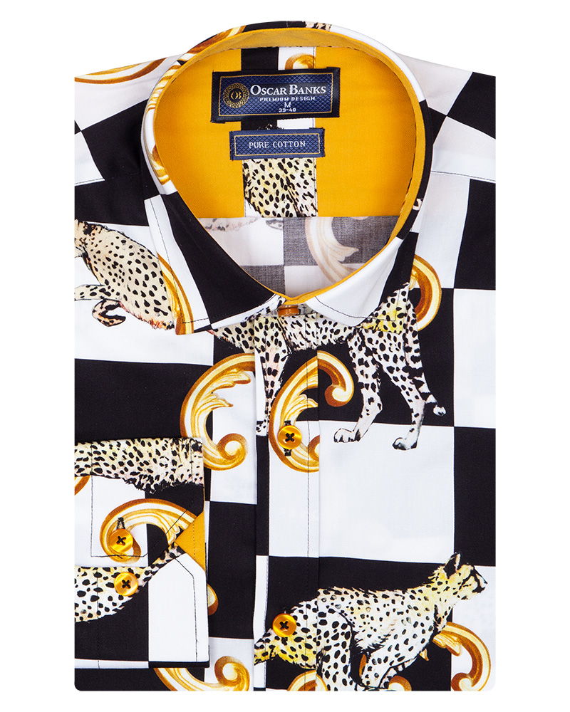 * %100 cotton* Very soft fabric* Printed design* Inside placket details* Contrasting Collar/Cuff InsertLeopards printed, white and black checkered long sleeve pure cotton mens shirt branded by Oscar Banks. Elegant and dapper mens choice.FeaturesCollar Type:Classic CollarFabric Type:%100 CottonPattern Type:AnimalCuff Type:Single CuffFit Type:Slim Fit, Regular Fit
