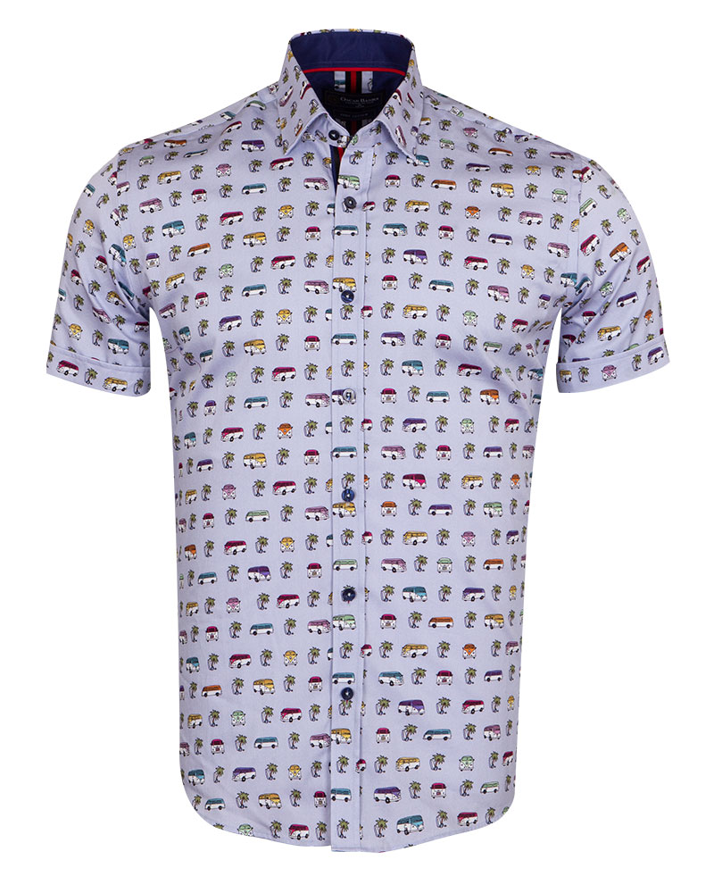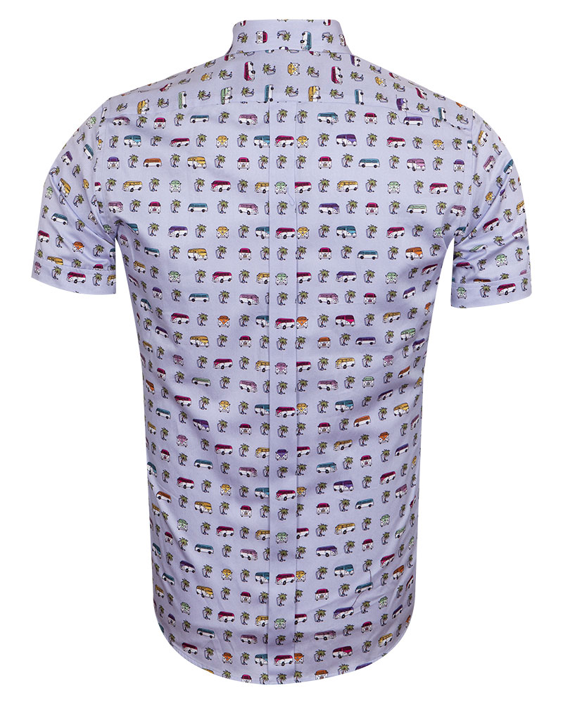 Bus and palm printed short sleeved mens shirt. Manufactured with premium cotton fabrics. Suitable for spring and summer seasons.